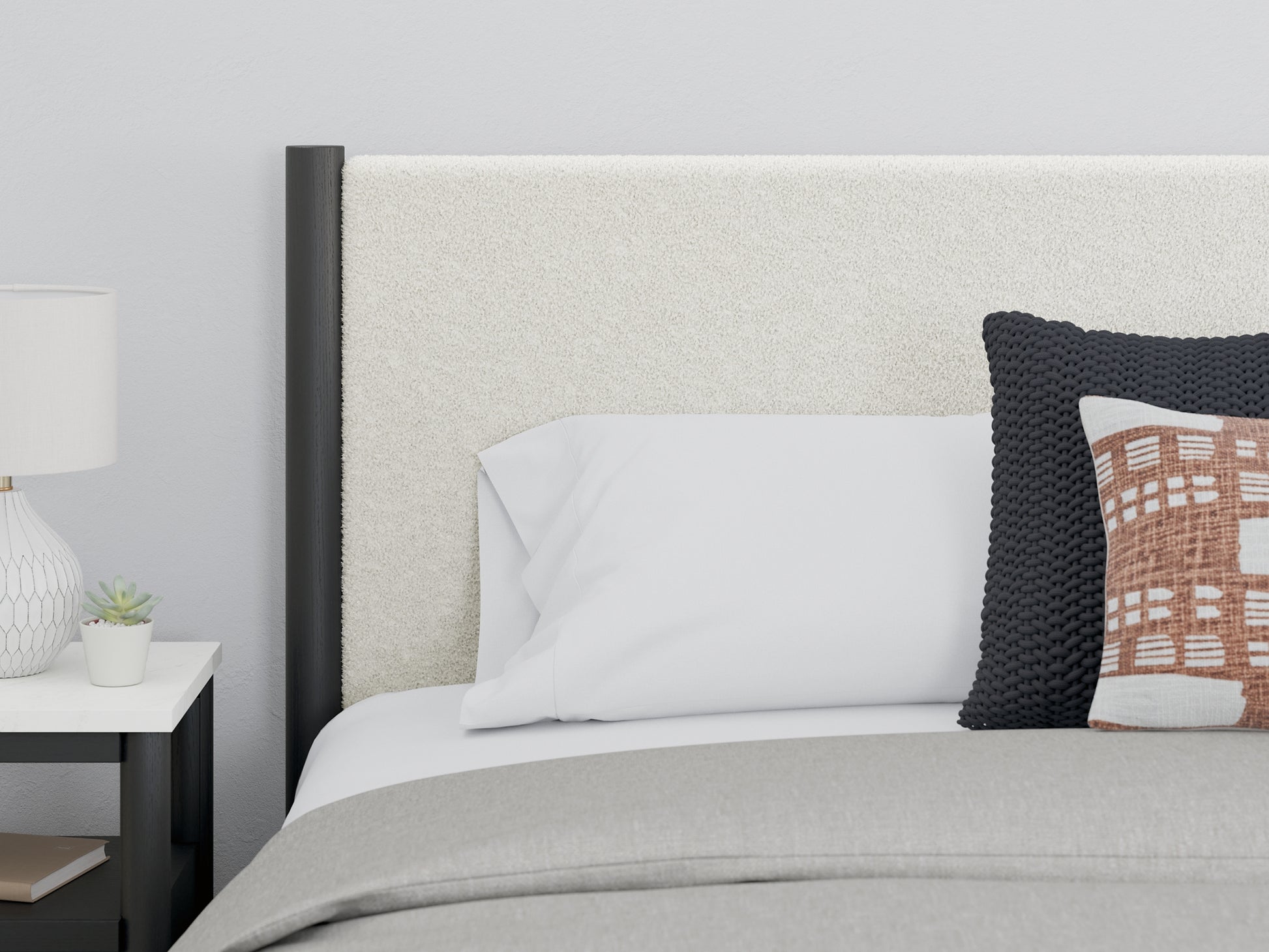 This queen upholstered panel bed reflects your sophisticated approach to boho style. Crafted with both form and function in mind, its fresh white fabric beautifully contrasts the matte black finish. The versatile design suits all-neutral spaces or blends with your favorite pops of color. It’s inviting, yet posh. Luxe, yet laid-back. With this bed, your free-spirited vibe meets modern design.