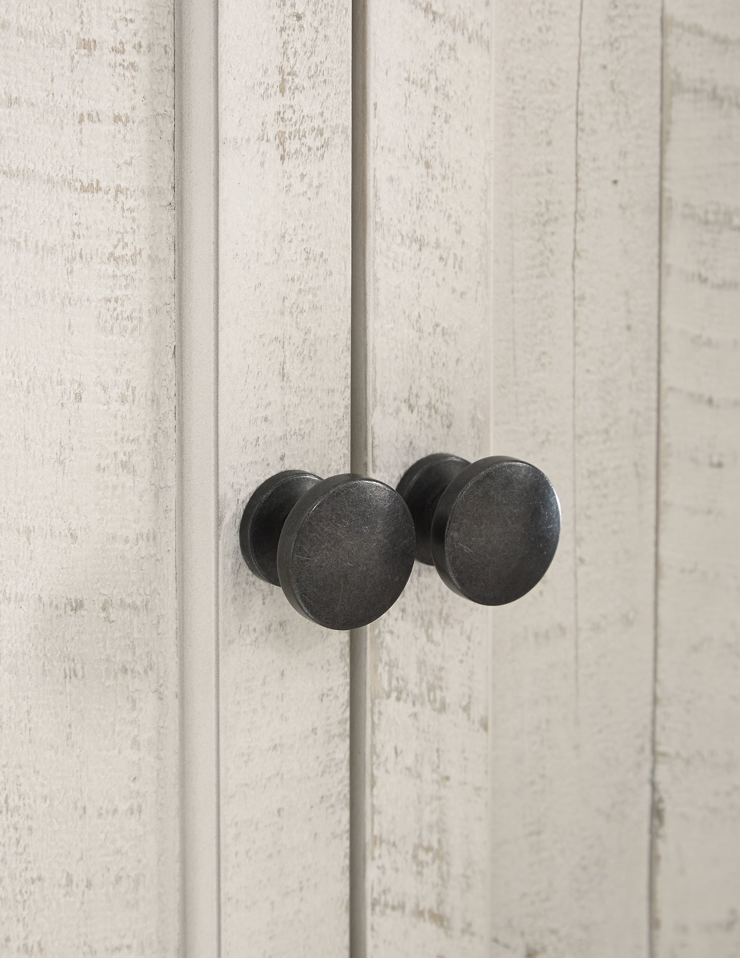 Details | Includes TV stand, 2 pier cabinets and bridge, Made of pine wood, pine veneer and engineered wood , Two-tone distressed finish: weathered gray top; vintage white base, TV stand with 2-door cabinet with single-shelf storage and 2 open shelves, Each pier cabinet with 2 fixed shelves and cabinet with single-shelf storage, Aged iron-color hardware, Cutouts for wire management, Assembly required | |